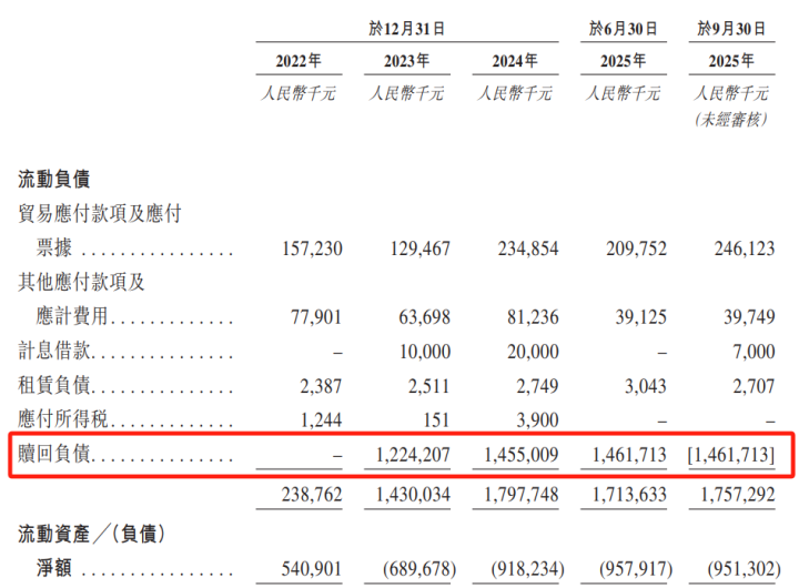 公司招股书败露,2023年、2024年及2025年前三季度,德风科技的赎回欠债分散为12.24亿元、14.55亿元和14.62亿元,呈现出逐年攀升的趋势。